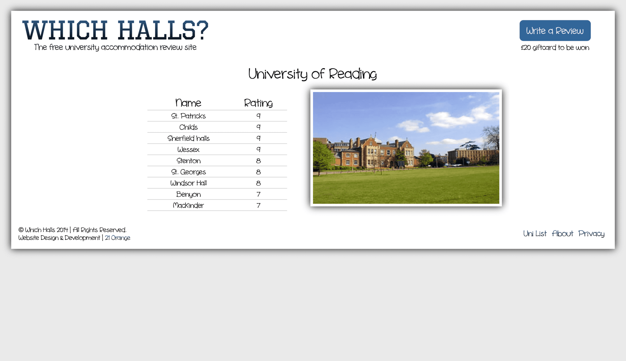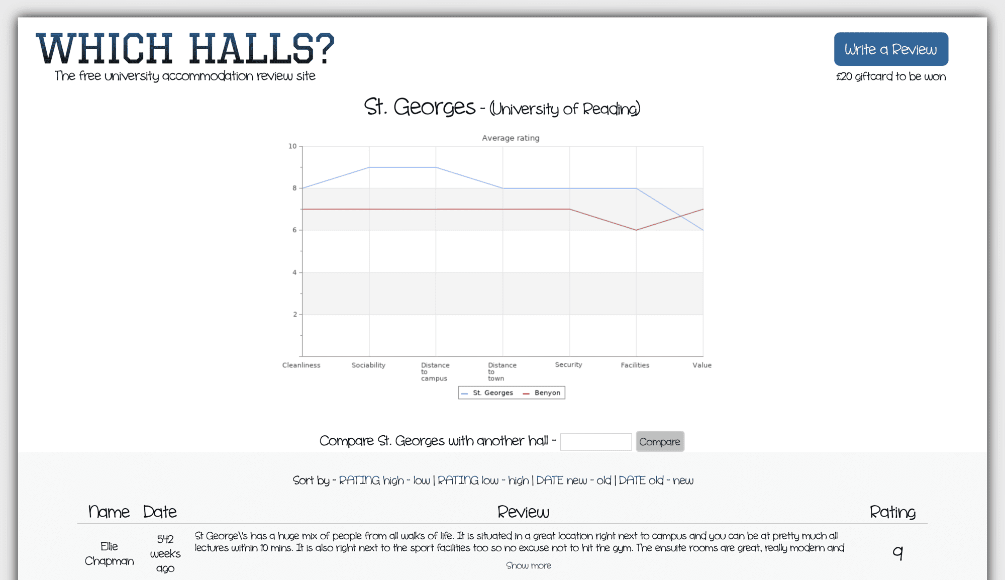 During my first year of university, I developed a website that allowed past and current university students to write reviews of their halls of residence. Each review included specifics such as cleanliness, security, and value for money, as well as a summary of the hall.